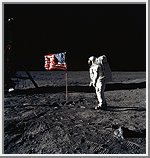 Astronaut Edwin E. Aldrin, Jr., lunar module pilot of the first lunar landing mission, poses for a photograph beside the deployed United States flag during Apollo 11 Extravehicular Activity (EVA) on the lunar surface. The Lunar Module (LM) is on the left, and the footprints of the astronauts are clearly visible in the soil of the Moon. Astronaut Neil A. Armstrong, commander, took this picture with a 70mm Hasselblad lunar surface camera. While astronauts Armstrong and Aldrin descended in the LM the "Eagle" to explore the Sea of Tranquility region of the Moon, astronaut Michael Collins, command module pilot, remained with the Command and Service Modules (CSM) "Columbia" in lunar-orbit. |
