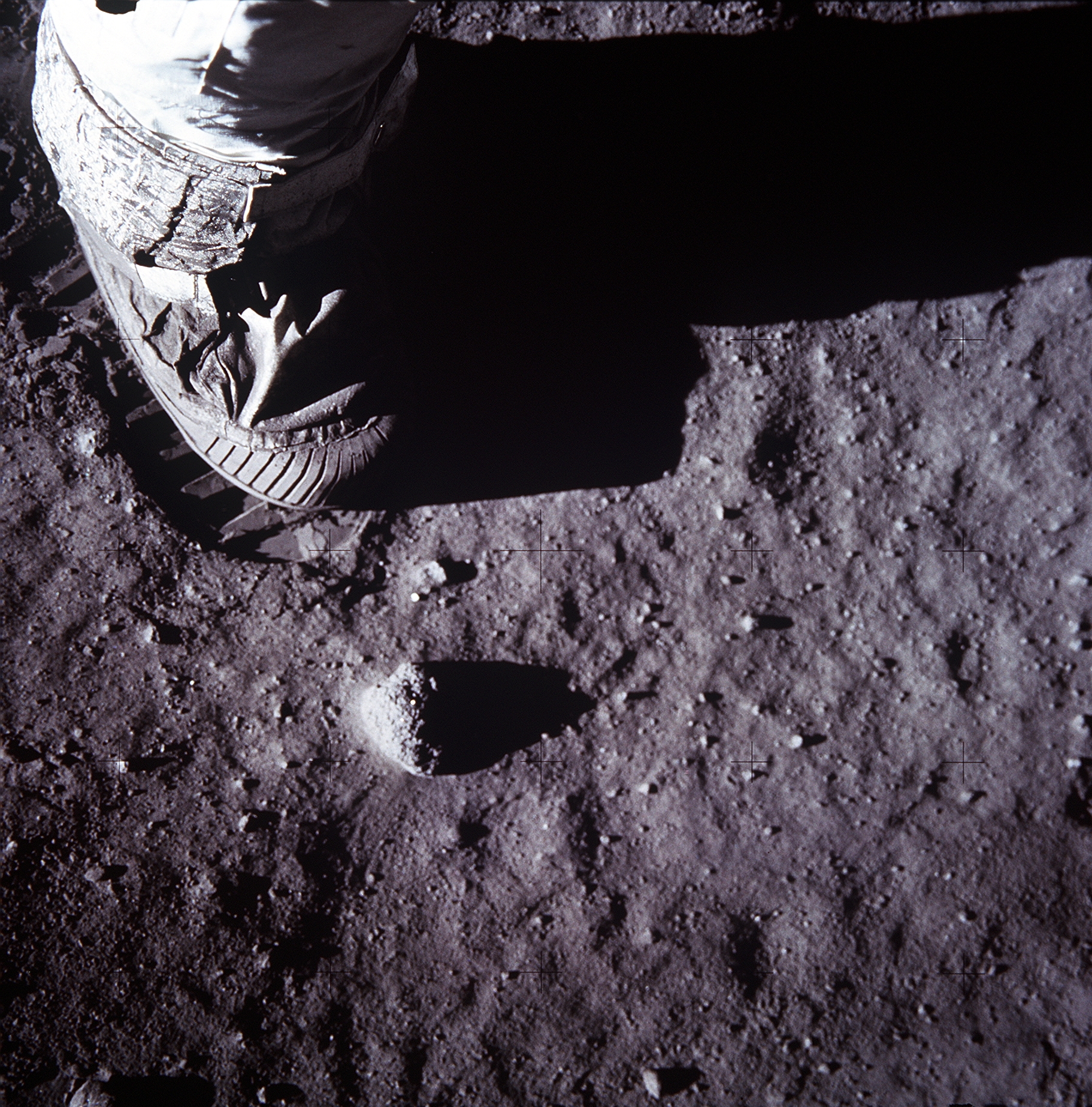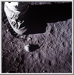 A close-up view of an astronaut's foot and foot print in the lunar soil, photographed with a 70mm lunar surface camera during the Apollo 11 lunar surface extravehicular activity (EVA). While astronauts Neil A. Armstrong, commander, and Edwin A. Aldrin, Jr., lunar module pilot, descended in the Lunar Module (LM) "Eagle" to explore the Sea of Tranquility region of the Moon, astronaut Michael Collins, command module pilot, remained with the Command and Service Modules (CSM)" Columbia" in lunar orbit. |