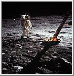 Astronaut Edwin E. Aldrin, Jr., lunar module pilot, walks on the surface of the Moon near a leg of the Lunar Module during the Apollo 11 extravehicular activity (EVA). Astronaut Neil A. Armstrong, Apollo 11 commander, took this photograph with a 70mm lunar surface camera. The astronauts' footprints are clearly visible in the foreground. While astronauts Armstrong and Aldrin descended in the Lunar Module (LM) "Eagle" to explore the Sea of Tranquility region of the Moon, astronaut Michael Collins, command module pilot, remained with the Command and Service Modules (CSM) "Columbia" in lunar orbit. |