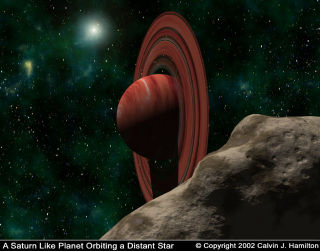 As man reaches out to the stars, what might he discover? New planetary systems, new earths, or perhaps new planets with rings? This artistic rendering shows a ringed planet reminiscent of our own Saturn orbiting a distant sun. In the foreground, is pictured one of its irregular moons. |
