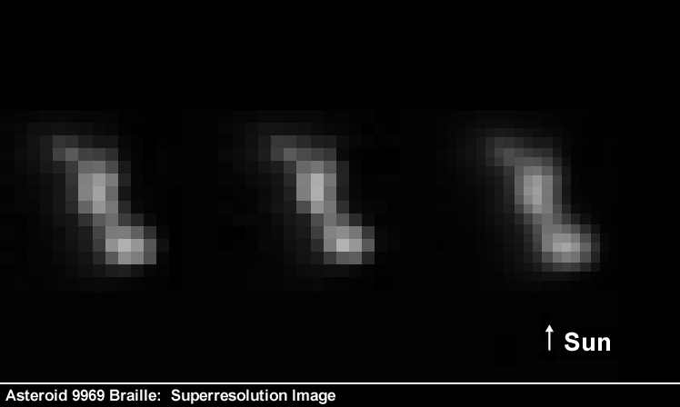 The two images on the left hand side of this composite image frame were taken 914 seconds and 932 seconds after the recent Deep Space 1 (DS1) encounter with the asteroid 9969 Braille by the Miniature Integrated Camera Spectrometer (MICAS). The image on the right was created by combining the two images on the left. The Sun is illuminating Braille from below , as is indicated by the arrow. Braille (also known as 1992 KD) was discovered on May 27, 1992 by astronomers Eleanor Helin and Kenneth Lawrence using the 46 centimeter (18 inch) Shmidt telescope at Palomar Observatory, while scanning the skies as part of the Palomar Planet-Crossing Asteroid Survey. Deep Space 1 was launched into orbit around the Sun on October 24, 1998 at 5:08 a.m. Pacific Daylight Time from Cape Canaveral Air Station, Florida on a Delta 7326, a variant of the Delta II rocket. An ion engine, operating for more than 1800 hours, was used to maneuver the spacecraft for an encounter with Braille. The closest approach of DS1 to the asteroid, at an approximate distance of 15 kilometers, occurred on July 29,1999 at 04:45 Universal Time, July 28 at 9:46 p.m. Pacific Daylight Time. |
