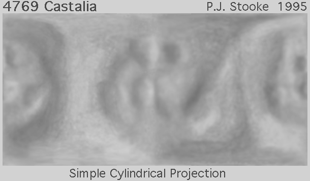 This image is a shaded relief map of asteroid 4769 Castalia, previously known as 1989 PB. It is the same map as in Castalia.gif, but reprojected to the Simple Cylindrical Projection. As with all maps, it is the cartographer's interpretation and not all features are necessarily certain given the limited data available - this interpretation stretches the data as far as is feasible. This map has not yet been published. Castalia was discovered by E. Helin on 9 August 1989, and imaged at very low resolution by delay-doppler radar at Goldstone and Arecibo later in August 1989. Images are described in: Ostro, S.J., Chandler, J.F., Hine, A.A., Rosema, K.D., Shapiro, I.I. and Yeomans, D.K., 1990. "Radar Images of Asteroid 1989 PB". SCIENCE, v. 248, pp. 1523-1528.A spherical harmonic model of the shape of Castalia was derived from the radar images and is described in: Hudson, R.S. and Ostro, S.J., 1994. "Shape of Asteroid 4769 Castalia (1989 PB) from Inversion of Radar Images". SCIENCE, v. 263, pp. 940-943.I used the published rendered images of that shape model to derive a digital shape model (radii at regular increments of latitude and longitude). The digital model was constrained by the positions of edges and other features in the rendered images, as if they were limbs in spacecraft images. Positions in the map are controlled by the digital shape model. Initially, the three dimensional convex hull of the shape model was projected into the Morphographic Conformal Projection (the conventional Stereographic Projection modified for non-spherical worlds). Longitudes are arbitrary, but for consistency with maps of other small bodies the prime meridian (longitude 0) has been placed at one end of the elongated body. This is 60 degrees west of the prime meridian as defined by Hudson and Ostro. In this map, longitude 0 is at the centre of the map and longitudes run up to 180 degrees from the centre to the left edge and then 180 to 360 from the right edge back to the centre. The surface morphology drawn on the Morphographic projection (seen in Castalia.gif) was then reprojected to the cylindrical projection used here. Surface features are based on the rendered images, and the 'dimples' are not necessarily to be considered as impact craters, though some may be. This version of the file, with labels intact, is in the public domain. Philip Stooke, Department of Geography, University of Western Ontario, London, Ontario, Canada N6A 5C2 stooke@sscl.uwo.ca |