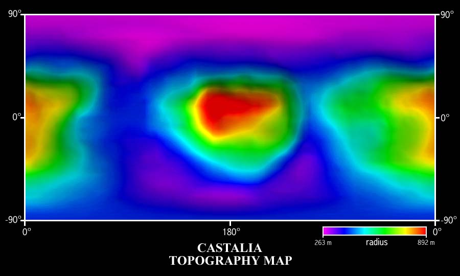 This is a topographic map of Castalia. It is based upon the shape model of Phil Stooke which he produced using rendered images of the shape model by R.S. Hudson and S.J. Ostro. As with all maps, it is the cartographer's interpretation; not all features are necessarily certain given the limited data available. This interpretation stretches the data as far as possible. This image is Copyrighted © 1997 by A. Tayfun Oner. Permission is granted to use this image at home for personal enjoyment. Educators may use this image in their class rooms. Any commercial/for-profit use of this image needs to be addressed to Calvin J. Hamilton. |