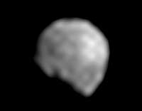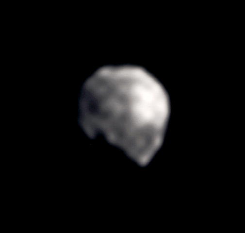 This image is a closeup of the newly discovered moon of the asteroid Ida, provisionally designated '1993 (243) 1.' This is a magnified, processed version of the single view of the natural satellite transmitted so far by the Galileo spacecraft to Earth. Only 1.5 kilometers (1 mile) across in this view, the overall shape, size, rotation and orbital motion of the natural satellite are still unknown. The sun's illumination is coming from the upper right. The black 'gouge' in the body's shape toward the lower left is probably more apparent than real and is mostly a part of the shadowed night side of the little moon. A rugged landscape, including one or two craters, appears to be present, although the smallest features that can be detected in this picture are about 1/7th the diameter of the natural satellite. This picture was taken by Galileo during its flyby of Ida on August 28, 1993. Later in the spring of 1994, scientists hope to receive other views of Ida's moon which are currently stored on Galileo's onboard tape recorder; one of those images is expected to be at least three times sharper than this one. The Jet Propulsion Laboratory manages the Galileo Project for NASA's Office of Space Science. |