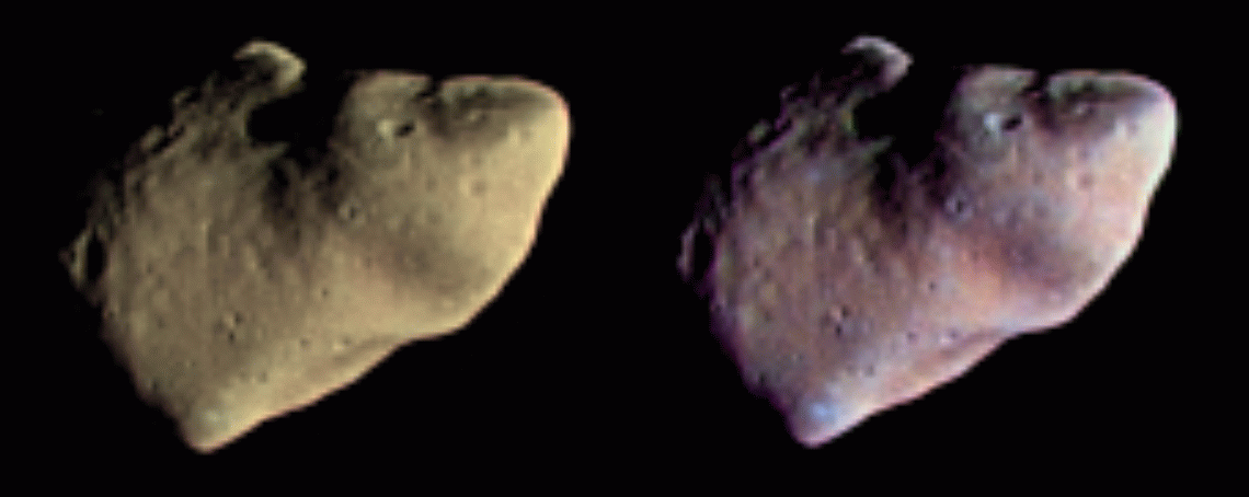 These two color views of the asteroid Gaspra were produced by combining three images taken through violet, green, and infrared filters by the Galileo spacecraft on October 29, 1991, from a distance of about 16,000 kilometers (10,000 miles). The view on the left shows Gaspra in approximately true color; the surface is covered with rocks that are somewhat less grey than those on Earth's moon. In the version on the right, the colors were enhanced to bring out the muted color variations on the asteroid and to increase the ability to discriminate between surface features. The subtle variations in color may be due to slight differences in rock composition or to differences in the texture of the surface layer. These possibilities should be resolved once the rest of Galileo's Gaspra data are played back in 1992. Gaspra is about 19 by 12 by 11 kilometers (12 by 7.4 by 7 miles) and irregular in shape. The illuminated portion seen in these views is about 16 by 12 kilometers. These color images were produced for the Galileo project by the U.S. Geological survey, Flagstaff, Arizona. The Galileo project whose primary mission is the exploration of the Jupiter system in 1995-97, is managed for NASA's Office of Space Science and Applications by the Jet Propulsion Laboratory. |