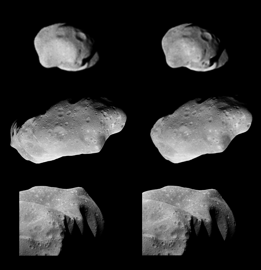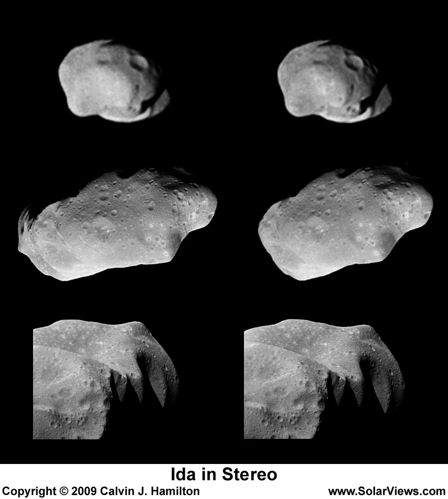 This image shows three different stereo image pairs of Ida. They were acquired by the Galileo spacecraft during its approach to Ida. The top image pair is the lowest resolution and the bottom image the highest. The stereo, three-dimensional view can been seen by looking at the left image with the left eye and the right image with the right eye. Print a small version of the image on a page, hold the page close to your face, relax your eyes as if you were looking in the distance, and slowly move the page away from your eyes. The image pairs will merge together to become one image. It may take some practice to see the images in stereo. This image is Copyrighted © 1997 by Calvin J. Hamilton. Permission is granted to use this image at home for personal enjoyment. Educators may also use this image in their class rooms. Any commercial/for-profit use of this image needs to be addressed to Calvin J. Hamilton. |