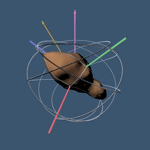 This image shows the shape and non-principal-axis spin state of asteroid 4179 Toutatis rendered at a particular instant. The red, green, and blue axes are the principal axes of inertia; the magenta axis is the angular momentum vector; the yellow axis is the spin vector. If you attached a flashlamp to the short axis of inertia (the red axis) and flashed it every 15 minutes for a month, it would trace out the intricate path indicated by the small spheres stacked end-to-end. If you continued this process forever you would find that the path never repeats. Toutatis's spin state differs radically from those of the vast majority of solar system bodies that have been studied, which are in principal-axis spin states. For those objects the flashlamp path would be a simple circle that would repeat endlessly. (© Copyright 1995 by the AAAS) |