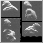 This image shows four frames of asteroid Toutatis that were obtained on December 8-10 and 13, 1992. On each day, the asteroid was in a different orientation with respect to Earth. One large crater can be seen in the December 9 image (upper right) that measures about 700 meters (2,300 feet) in diameter. |