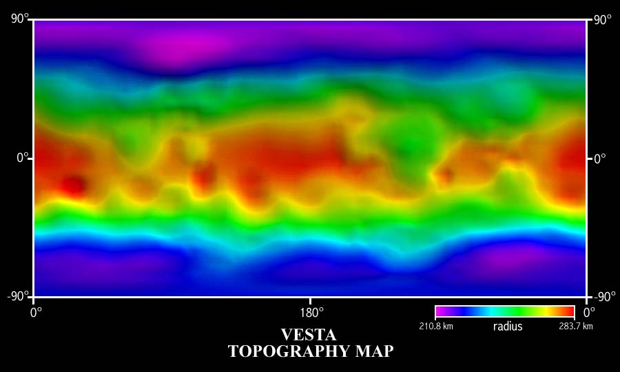 This is a topographic map of Vesta It is based upon the shape model of Phil Stooke. As with all maps, it is the cartographer's interpretation; not all features are necessarily certain given the limited data available. This interpretation stretches the data as far as possible. This image is Copyrighted © 1997 by A. Tayfun Oner. Permission is granted to use this image at home for personal enjoyment. Educators may use this image in their class rooms. Any commercial/for-profit use of this image needs to be addressed to Calvin J. Hamilton. |