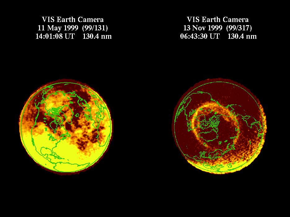 This pair of images in visible light compares the northern auroral regions on May 11, 1999, and a more typical day on November 13, 1999. |