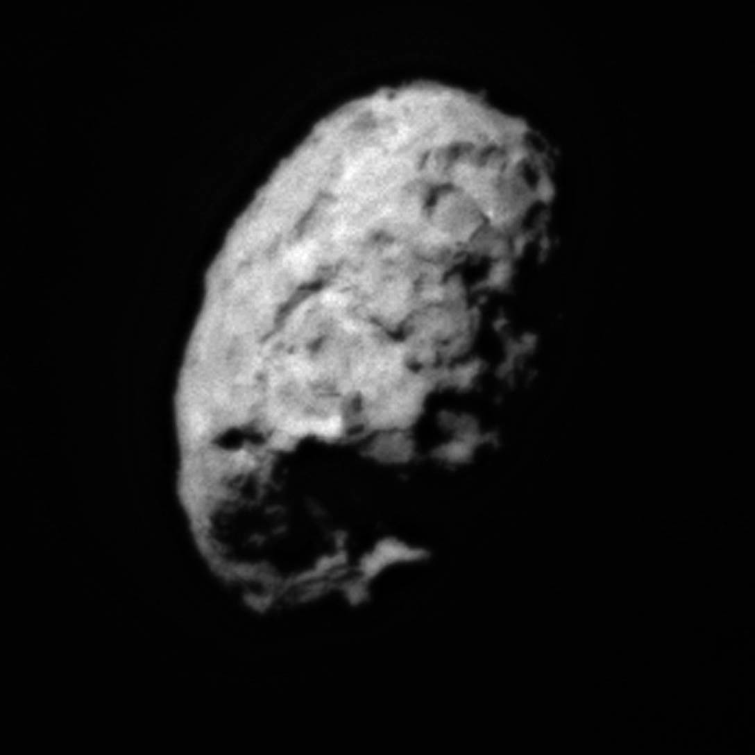 This image was taken during the close approach phase of Stardust's January 2, 2004 flyby of comet Wild 2. It is a distant side view of the roughly spherical comet nucleus. One hemisphere is in sunlight and the other is in shadow analogous to a view of the quarter moon. Several large depressed regions can be seen. Comet Wild 2 is about five kilometers (3.1 miles) in diameter. |