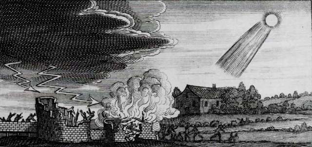 Woodcut showing destructive influence of a fourth century comet from Stanilaus Lubienietski's Theatrum Cometicum (Amsterdam, 1668). |