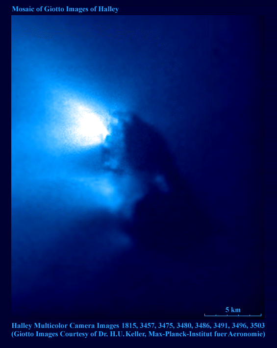 This image is a mosaic of 8 images taken by the Giotto spacecraft during the Halley encounter on March 13, 1986. The nucleus dimensions are about 16 by 8 by 8 kilometers. By examining the dust jets being emitted from the nucleus, scientists were able to determine that only about 10% of the surface was active. |