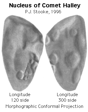 This is a shaded relief map of the nucleus of Comet 1/P Halley. As with all maps, it is the cartographer's interpretation and not all features are necessarily certain given the limited data available - this interpretation stretches the data as far as is feasible. The original map will be published in its full form with relief contours, a latitude-longitude grid, etc. in a forthcoming paper. Positions in the map are controlled by a digital shape model, to be described in that paper. For this map, the three dimensional convex hull of the shape model was projected into the Morphographic Conformal Projection (the conventional Stereographic Projection modified for non-spherical worlds). North is at the top in this map. The prime meridian is defined arbitrarily, but such that the central longitude in the first high resolution Vega 2 image is 270 degrees. Since the rotation about the long axis is from east to west, longitudes increase towards the east (right) in accordance with planetary cartographic convention. As with all conformal (true shape) projections, the scale in these maps varies, increasing from the centre to the outer edge. Halley is a particularly difficult object to map, given the nature of the data available. Many other interpretations might be possible. This relief drawing represents an attempt to show features visible on the disk in various spacecraft images, and the various ridges and hollows suggested by limb topography. Future work will involve attempting to locate active regions on the surface. My colleague Alain Abergel provided pointing data and other help throughout this mapping project, but any flaws in the map are entirely my responsibility. The map projection is described in: Stooke, P.J. and Keller, C.P., 1990. "Map Projections for Non-Spherical Worlds / the Variable-Radius Map Projections", CARTOGRAPHICA, V. 27, No. 2, pp. 82-100. This version of the file, with labels intact, is in the public domain. Philip Stooke, Department of Geography, University of Western Ontario, London, Ontario, Canada N6A 5C2 stooke@sscl.uwo.ca |
