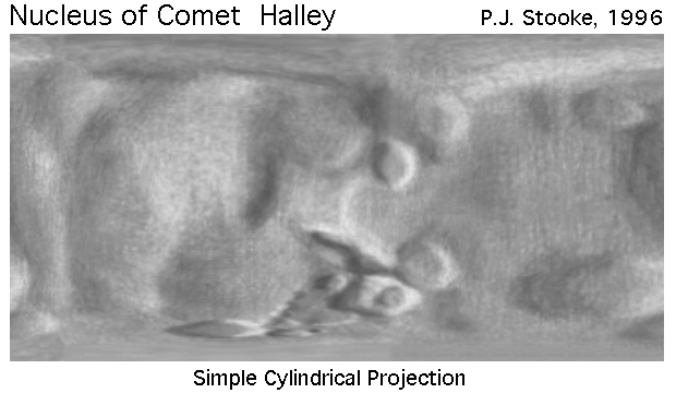 This is a shaded relief map of the nucleus of Comet 1/P Halley. It is the same map as Halley.gif, but has been reprojected to the Simple Cylindrical projection. As with all maps, it is the cartographer's interpretation and not all features are necessarily certain given the limited data available - this interpretation stretches the data as far as is feasible. Positions in the map are controlled by a digital shape model, to be described in a future paper. For this map the three dimensional convex hull of the shape model was projected into the Morphographic Conformal Projection (the conventional Stereographic Projection modified for non-spherical worlds). The relief drawing, initially prepared on that projection, was scanned and reprojected to this cylindrical projection. Longitude 180, defined arbitrarily, runs down the centre of the map. Halley is a particularly difficult object to map, given the nature of the data available. Many other interpretations might be possible. This relief drawing represents an attempt to show features visible on the disk in various spacecraft images, and the various ridges and hollows suggested by limb topography. Future work will involve attempting to locate active regions on the surface. My colleague Alain Abergel provided pointing data and other help throughout this mapping project, but any flaws in the map are entirely my responsibility. This version of the file, with labels intact, is in the public domain. Philip Stooke, Department of Geography, University of Western Ontario, London, Ontario, Canada N6A 5C2 stooke@sscl.uwo.ca |