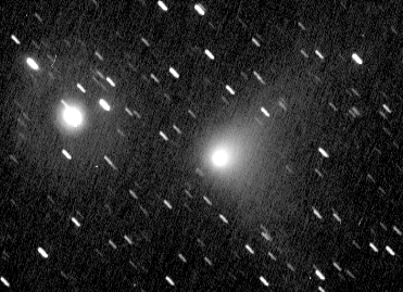 This is a CCD image of comet 1993a "Mueller", taken on October 6, 1993, using SBIG's ST-6 CCD-camera and a 288mm f/5.2 Schmidt-Cassegrain telescope.The exposure lasted from 19:11 U.T. to 19:21 U.T. The field of view is 19.6' x 14.4'. The comet has a coma diameter of some- what more than 3' and a fan-shaped tail, up to 7' long, between P.A. 220o and P.A. 310o. (Sorry, I mixed that up in my posting last week: 1993a has a fan-shaped tail oriented around P.A. 270o, while 1993p shows a slender AN-tail pointing nearly exactly northward. However, this an-tail may not be visible any longer...) The brightest star visible (PPM 7788) is of photographic magnitude 8.8. In this GIF-image, this star and the head of the comet appear to be nearly of the same brightness. However, a close inspection of the original CCD-image (which has a resolution of 16 bit per pixel rather than 8 bit for GIFs) shows that the star trail is satured at a value of 65535, while the brightest pixel in the comet's head reaches a value of only 15608. According to our measurements, the comet is of mag 10.5 in red light (where unfiltered, thick CCD's are most sensitive).Keep in mind that a comet has usually bright emissions in blue and green light, where our CCD is not that sensitive. (Courtesy Erich Meyer and Herbert Raab, Austria) |