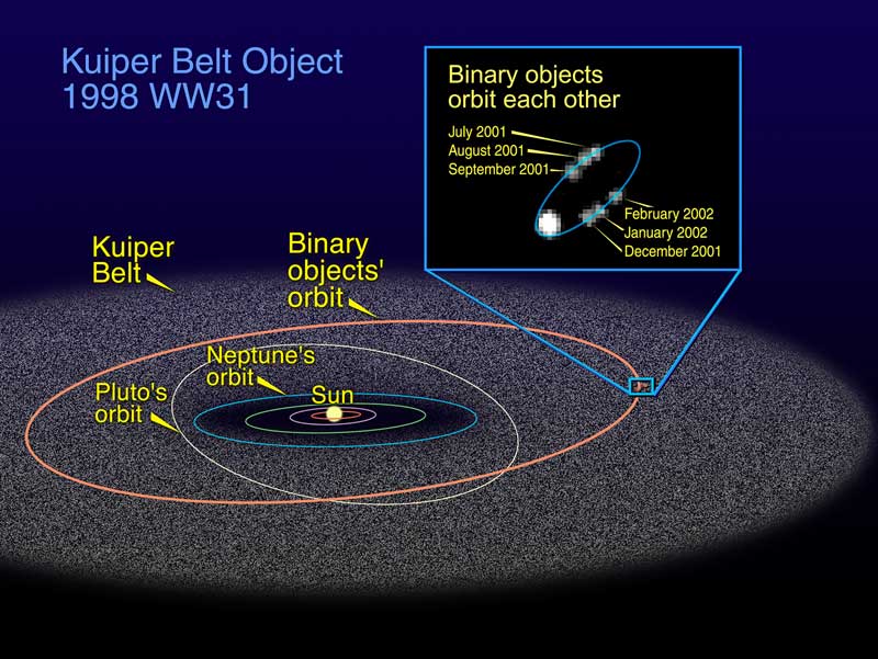 With the help of NASA's Hubble Space Telescope, astronomers have determined that 2002 LM60, an icy Kuiper belt object dubbed "Quaoar," by its discoverers, is the largest body found in the solar system since the discovery of Pluto 72 years ago. Quaoar (pronounced kwa-whar) is about half the size of Pluto. Like Pluto, Quaoar dwells in the Kuiper belt, an icy debris field of comet-like bodies extending 7 billion miles beyond Neptune's orbit. The photograph at bottom right, taken by Hubble's Advanced Camera for Surveys, is a close-up view of the icy world. Only Hubble's sharp vision can resolve the disk of this distant world, leading to the first-ever direct measurement of the true size of a Kuiper belt object. Quaoar's diameter is about 800 miles (1300 kilometers). It is the farthest object in the solar system ever to be resolved by a telescope. The Hubble photo does not show details of Quaoar's icy surface because the object is too far away. Quaoar is about 4 billion miles (6.5 billion kilometers) from Earth, more than 1 billion miles farther than Pluto. The photograph was made by assembling 16 pictures of the object. Observations were made July 5, 2002 and Aug. 1, 2002. The image at upper right is a composite of 16 snapshots of the object as it traveled across the sky. Quaoar is in a circular orbit around the Sun. The snapshots were taken over a 29- minute span on July 5. The photograph at left, part of the Digitized Sky Survey, shows the Kuiper belt object's approximate path across the summer constellation Ophiuchus. The small box in the center defines Hubble's narrow view, an area devoid of stars. |