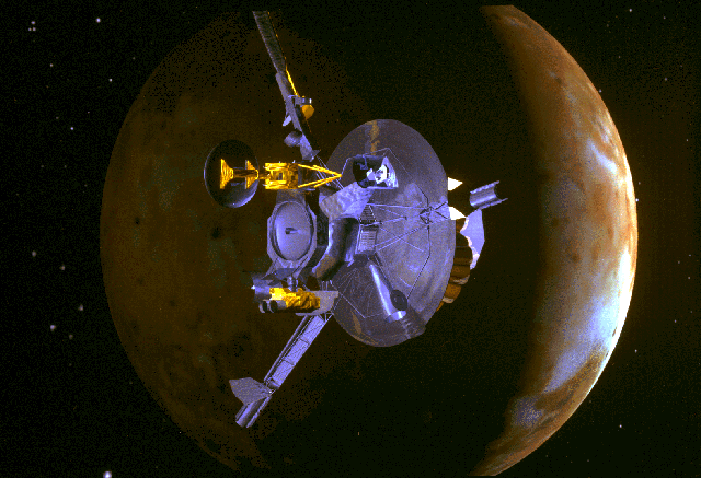 NASA's Galileo spacecraft has found Jupiter's volcanic moon Io to have a huge iron core that takes up half its diameter. The spacecraft's 899 kilometer (559-mile) flyby of Io on December 7, 1995 is depicted in this computer graphics painting. Galileo also detected a large "hole" in Jupiter's magnetic field near Io, leading to speculation about whether Io possesses its own magnetic field. If so, it would be the first planetary moon known to have one. The mission is conducted for NASA by JPL. |