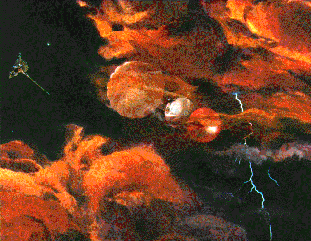 In this artist's rendering the Galileo probe, with its heat shield below and a parachute above, enters the turbulent upper atmosphere of Jupiter. Galileo released its probe in September 1995, about 150 days before it was scheduled to reach Jupiter. The orbiter's trajectory will be corrected to send it into Jupiter orbit. The probe was scheduled to enter the upper atmosphere on December 7, 1995, at about 48 kilometers (30 miles) per second. Data from its six instruments were to be relayed to Earth via the orbiter during the probe's expected 75 minutes of operation before temperature and pressure destroy it. |