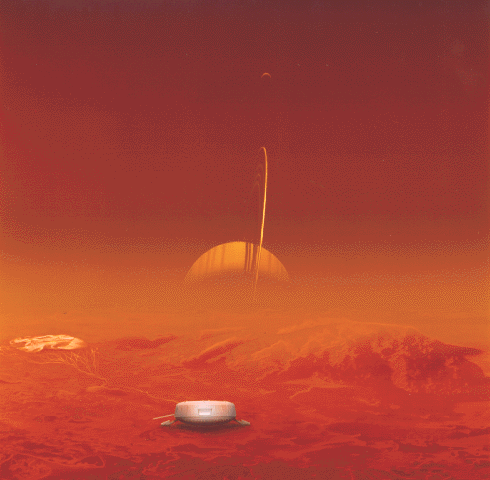 This artist's rendering shows the Huygens probe on the surface of Saturn's moon Titan after being released by NASA's Cassini spacecraft. |