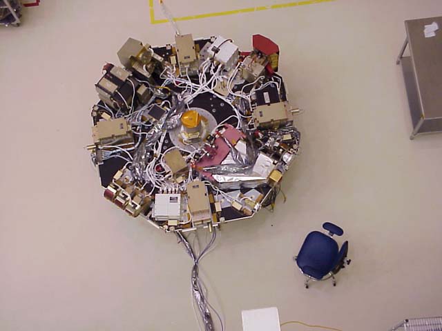 This view shows the instument deck of the IMAGE observatory. It is located in the middle of the spacecraft. Below the deck are four bays that contain subsystems for electrical power, communications, command & data handling, and attitude determination and control. |