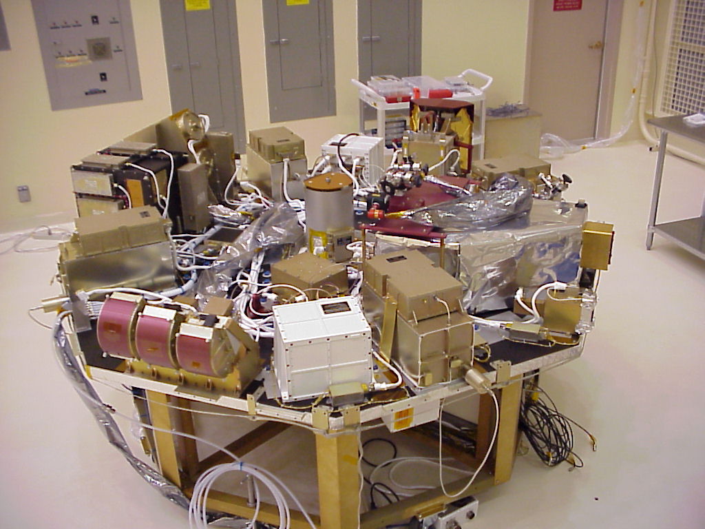 This picture shows a side view of the instruments contained on the intrument deck. This includes a suite of three Neutral Atom Imaging instruments used to record the glow of fast atoms coming from throughout the Earth's magnetic field. The Far Ultraviolet Imaging instrument will collect images from space of the Earth's proton aurora. The Extreme Ultraviolet Imager is used to capture images of the plasmasphere, which is the tenuous extension of the Earth's electrically charged upper atmosphere, or ionosphere. The Radio Plasma Imager instrument provides a three-dimensional view of the plasmasphere by sounding it with radio pulses, like an ultrasound image of the human body. To accomplish this, it uses the longest antennas ever deployed in space, longer than the height of the Empire State Building. |