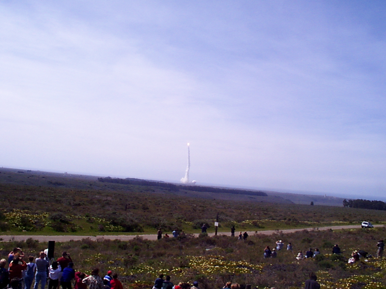 Spectators watch from a distance as the IMAGE spacecraft lifts of from the launch pad at Vandenberg Air Force Base. |