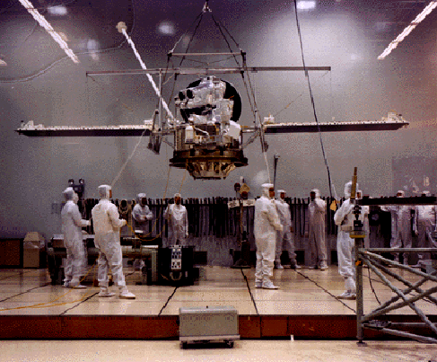 Here the Mariner 10 spacecraft is being assembled prior to its November 1973 launch. During its two-year mission, the spacecraft transmitted more than 12,000 images of Mercury and Venus. The mission ended in March 1975. Mariner 10 is still orbiting the sun, even though its electronic systems have probably been destroyed by solar radiation. |