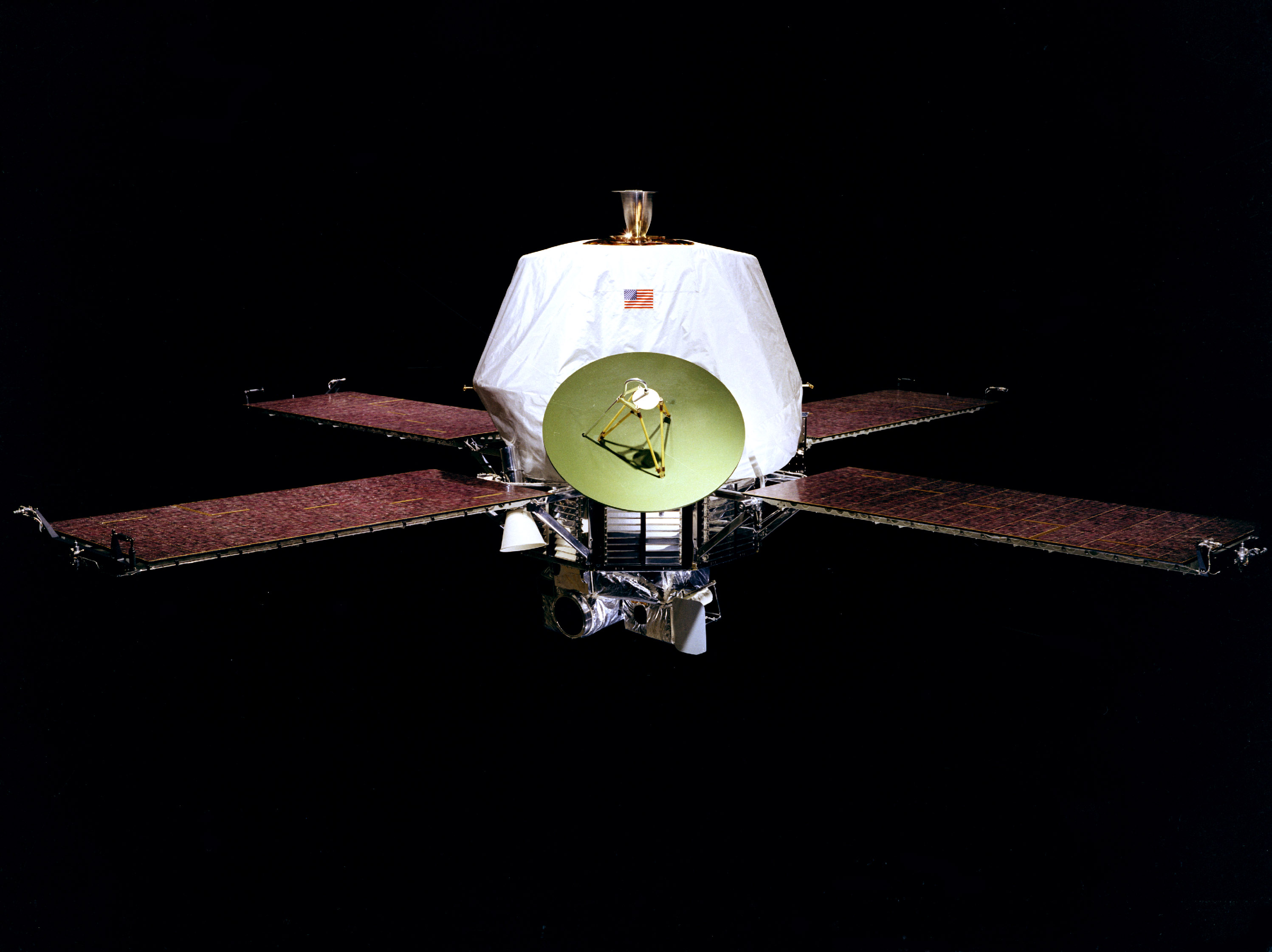 The 1971 Mariner Mars mission was planned to consist of two spacecraft on complementary missions, but due to the failure of Mariner 8 to launch properly, only one spacecraft was available. Mariner 9 combined mission objectives of both Mariner 8 (mapping 70% of the Martian surface) and Mariner 9 (a study of temporal changes in the Martian atmosphere and on the Martian surface). Mariner 9 became the first spacecraft to orbit another planet. Launched on May 30, 1971, the 506-kilogram (1,116-pound) spacecraft circled Mars twice each day for a full year, photographing the surface and analyzing the atmosphere with infrared and ultraviolet instruments. The spacecraft gathered data on the atmospheric composition, density, pressure, and temperature and also the surface composition, temperature, and topography of Mars. |