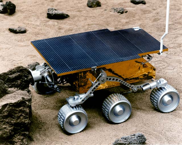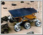 This image shows a model of the Mars Pathfinder rover as it might appear on the Surface of Mars. |