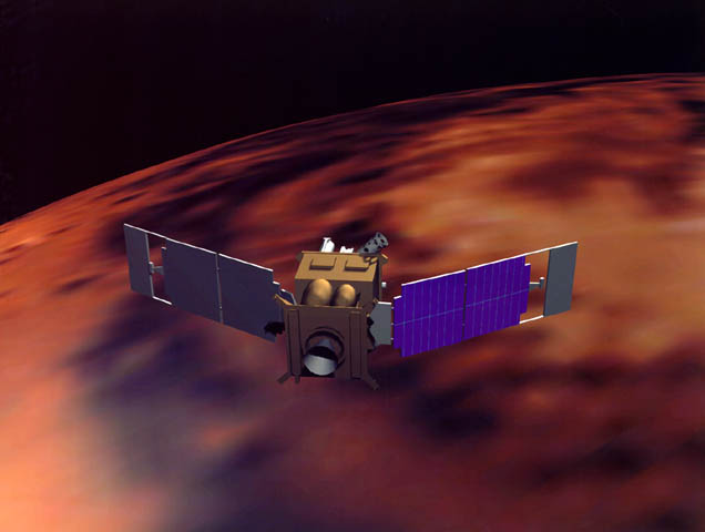 This computer-designed view of Mars Global Surveyor shows the modified aerobraking configuration which will be used to compensate for a solar panel that did not fully deploy after launch. The 3.5-meter (11-foot) wing on the right is the panel that did not latch in place after deployment. Consequently, it will be rotated 180 degrees so that the solar-cell side of the panel (the blue surface seen here) faces into the direction of the air flow that exerts drag force on the spacecraft as it dips repeatedly into the atmosphere. This way, the unlatched panel will not be in danger of folding up onto the spacecraft's main structure, nor will the panel be at any greater risk of heating up too much. Engineers on the Surveyor flight team determined that a piece of metal called the "damper arm," which is part of the solar array deployment mechanism located at the "shoulder" joint, where the entire panel is attached to the spacecraft body, was probably sheared off during deployment in the first day of flight. The lever that turns the shaft became wedged in a 2-inch space between the elbow joint and the edge of the solar panel, leaving the panel tilted at 20.5 degrees from its fully deployed and latched position. The tilted array caused the JPL/Lockheed Martin flight team to re-evaluate the aerobraking phase, of the mission, in which the spacecraft must rely almost solely on its solar panels as drags to lower it into a nearly circular mapping orbit over the poles of the planet. This phase of the mission will begin a week after Mars Global Surveyor is captured in orbit around Mars on Sept. 11, 1997, and will last approximately four months. Mars Global Surveyor is the first mission in a sustained program of robotic exploration of Mars, managed by the Jet Propulsion Laboratory for NASA's Office of Space Science, Washington, D.C. |