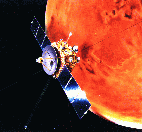 This artist's conception of Nozomi shows the Spacecraft in orbit around the red planet with its instrument masts fully deployed. Nozomi is a Mars orbiting aeronomy mission designed to study the martian upper atmosphere and its interaction with the solar wind and to develop technologies for use in future planetary missions. |