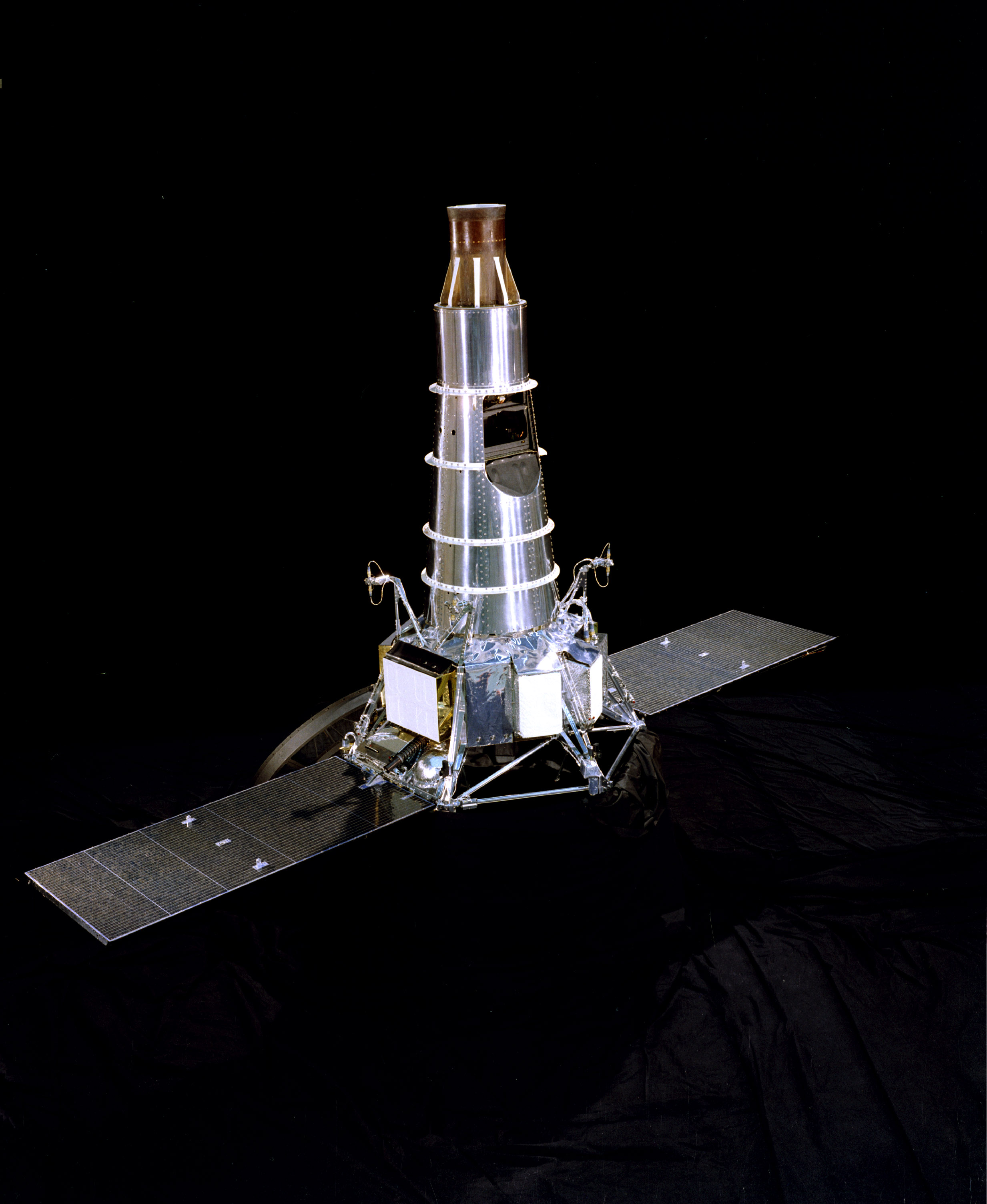 This is an image of the Ranger 7 spacecraft that was launched on July 28, 1964. It arrived at the Moon on July 31, 1964. The spacecraft carried six television cameras. It sent back high-resolution photographs of the lunar surface until its impact in an area between Mare Nubium and Mare Cognitum. |