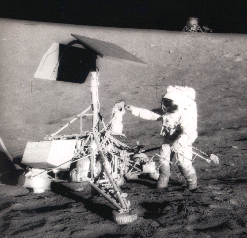 This photograph shows an Apollo 12 astronaut examining the Surveyor 3 lander in November 1969. Surveyor 3 landed on the moon on April 20, 1967 at 2.94° south latitude, 23.34° west longitude in the southeastern part of Oceanus Procellarum. Equipment on board included a television camera and auxiliary mirrors, a soil mechanics surface sampler, strain gauges on the spacecraft landing legs, and numerous engineering sensors. Two-and-a-half years later, Apollo 12 astronauts Pete Conrad and Alan Bean landed 156 meters (512 feet) away from Surveyor 3 and removed parts of the spacecraft for analysis back on Earth. |