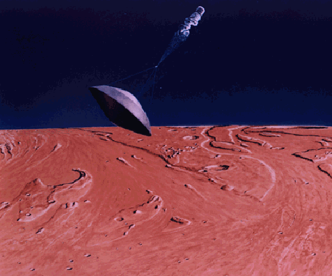 In this artist's rendering a Viking lander released its parachute just after entering the Martian atmosphere. When the parachute was deployed, the lander pod was at an altitude of about 6 kilometers (4.0 miles) and traveling at a velocity of 900 kilometers per hour (600 mph). Soon after, the lower half of the heat shield fell away and the lander's legs unfolded. At an altitude of about 1.5 kilometers (5,000 feet) the pod separated from the parachute and using three retro-engines to control its descent, landed safely on the surface of Mars. |