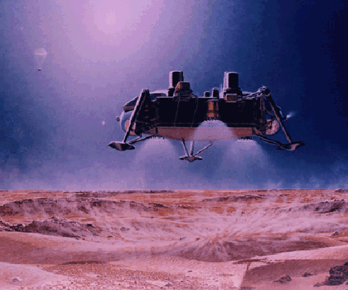 Captured here in this rendering is a Viking lander just before it touched down on the Martian surface. The parachute and upper aeroshell can be seen in the upper left corner of the image. At this stage of the descent, the lander's terminal descent propulsion system (three retro-engines) had slowed the craft down so that velocity at landing was about of 2 meters per second (7 mph). Seconds after the lander reached the surface it began transmitting images back to the orbiter for relay to Earth. |