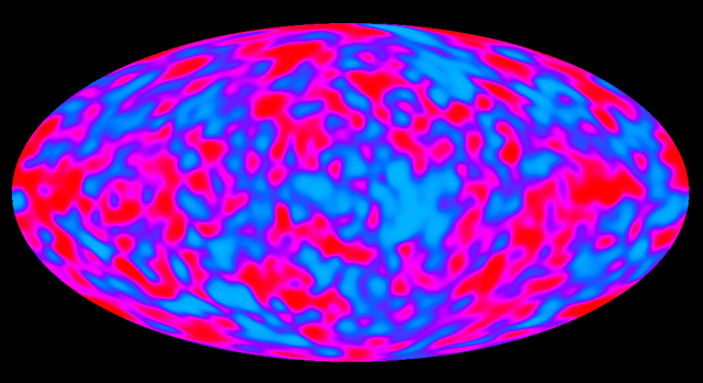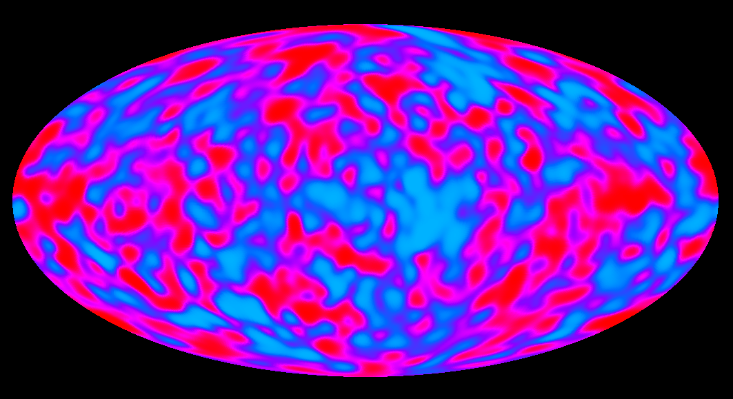 Following subtraction of the dipole anisotropy and components of the detected emission arising from dust (thermal emission), hot gas (free-free emission), and charged particles interacting with magnetic fields (synchrotron emission) in the Milky Way Galaxy, the cosmic microwave background (CMB) anisotropy can be seen. CMB anisotropy - tiny fluctuations in the sky brightness at a level of a part in one hundred thousand - was first detected by the COBE DMR instrument. The CMB radiation is a remnant of the Big Bang, and the fluctuations are the imprint of density contrast in the early Universe (see slide 24 caption). This image represents the anisotropy detected in data collected during the first two years of DMR operation. Ultimately the DMR was operated for four years. |
