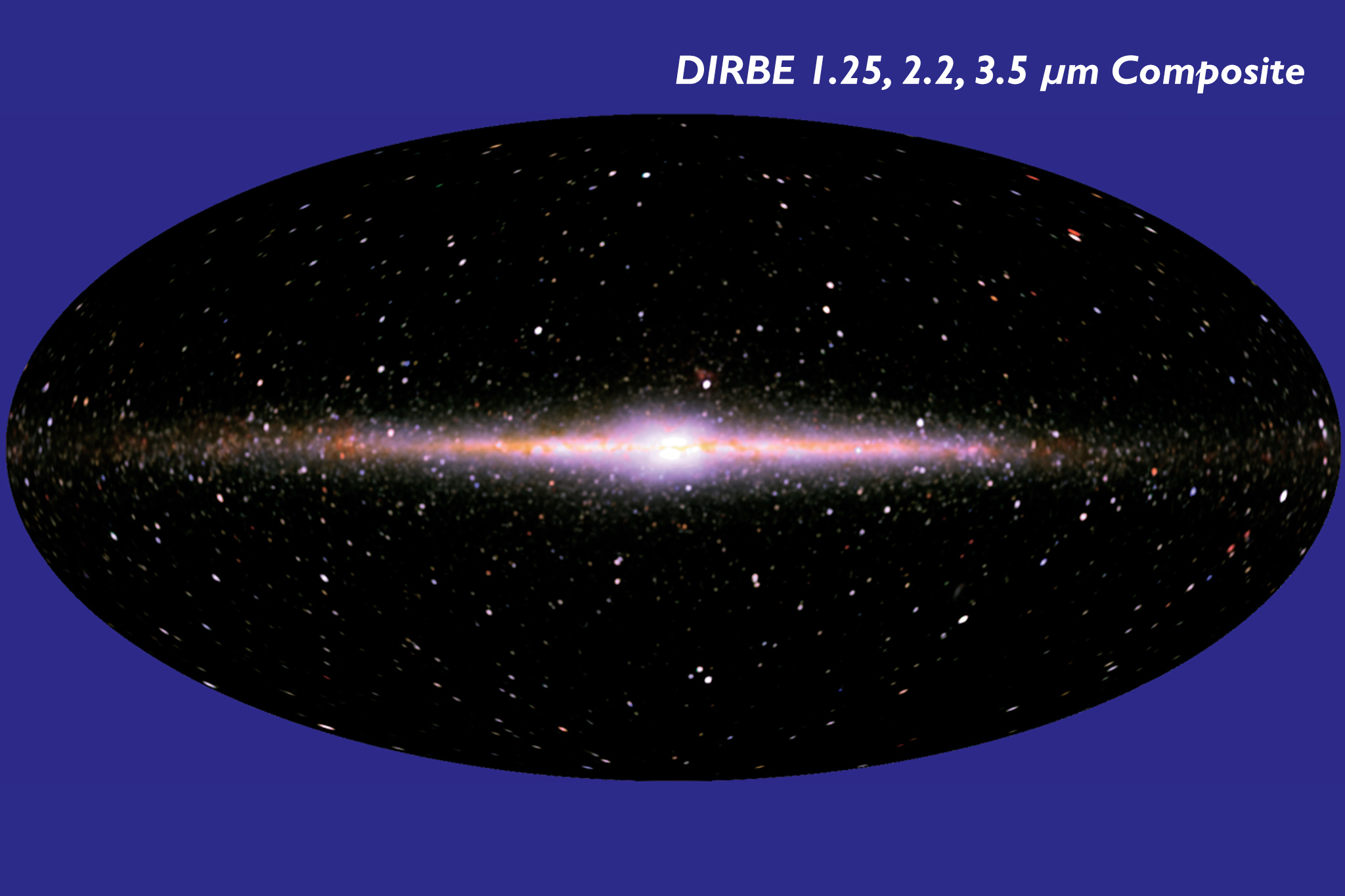 False-color image of the near-infrared sky as seen by the DIRBE. Data at 1.25, 2.2, and 3.5 µm wavelengths are represented respectively as blue, green and red colors. The image is presented in Galactic coordinates, with the plane of the Milky Way Galaxy horizontal across the middle and the Galactic center at the center. The dominant sources of light at these wavelengths are stars within our Galaxy. The image shows both the thin disk and central bulge populations of stars in our spiral galaxy. Our Sun, much closer to us than any other star, lies in the disk (which is why the disk appears edge-on to us) at a distance of about 28,000 light years from the center. The image is redder in directions where there is more dust between the stars absorbing starlight from distant stars. This absorption is so strong at visible wavelengths that the central part of the Milky Way cannot be seen. DIRBE data will facilitate studies of the content, energetics and large scale structure of the Galaxy, as well as the nature and distribution of dust within the Solar System. The data also will be studied for evidence of a faint, uniform infrared background, the residual radiation from the first stars and galaxies formed following the Big Bang. |