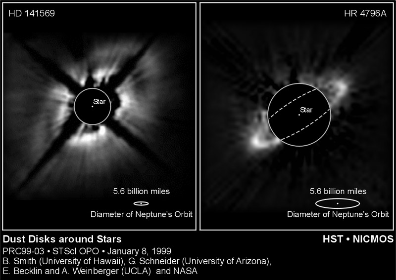 The Hubble image, taken at a wavelength of 1.1 microns, was made using the coronagraph in the Near Infrared and Multi-Object Spectrometer (NICMOS) to reduce the glare of the star. The observed radiation from the disk is caused by dust particles which reflect the light of the central star. The dark spikes in the image are regions where there are no useful data due to diffraction artifacts introduced by the optical systems of the telescope and camera. The central portion of the disk remains unseen because of residual glare from the bright star. Credit: Alycia Weinberger, Eric Becklin (UCLA), Glenn Schneider (University of Arizona) and NASA