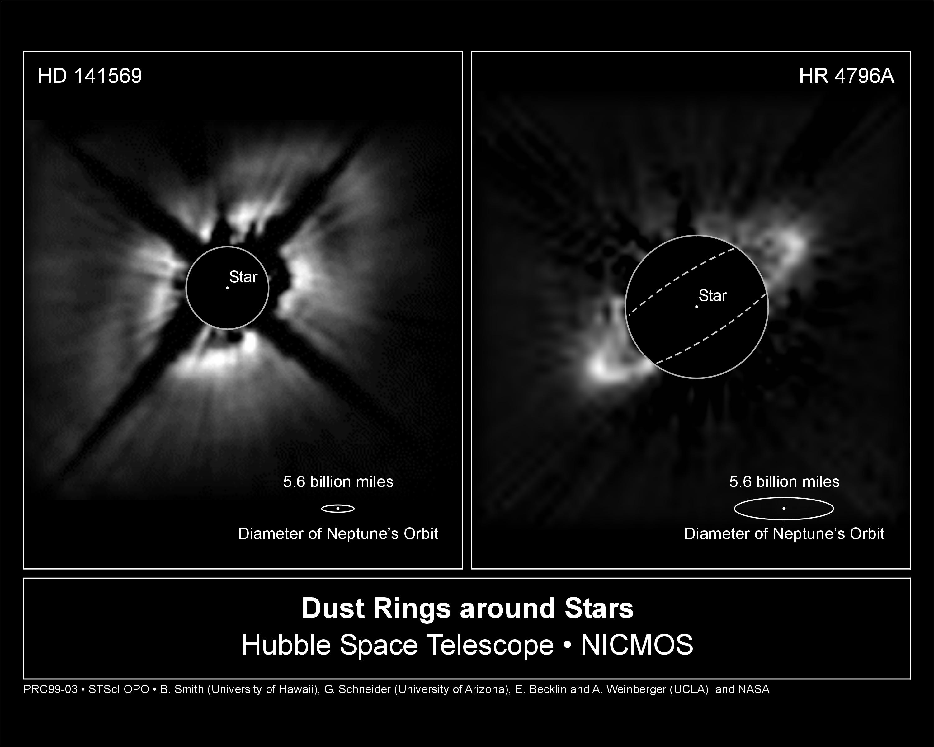 [right] The near-infrared light reflecting off the dust ring is about 1,000 times fainter than the illuminating central star. Astronomers used a coronagraphic camera on Hubble's Near Infrared Camera and Multi-Object Spectrometer (NICMOS), specifically designed to enable observations of very faint and low surface brightness objects in the close proximity to bright stars. Even with the coronagraph, the glare from HR 4796A overwhelms the much-fainter ring at distances less than about 4 billion miles (inside the blacked-out circle, centered on the star). Hubble's crisp view was able to resolve the ring, seen at lower resolution at longer wavelengths, in ground-based thermal infrared images, as a disk with some degree of central clearing. The ring has an angular radius of 1.05 arc seconds, equivalent to the apparent size of a dime seen more than 4 miles away. Unlike the extensive disks of dust seen around other young stars, the HR 4796A dust ring, 6.5 billion miles from the star, is tightly confined within a relatively narrow zone less than 17 Astronomical Units wide. An Astronomical Unit is the distance from the Earth to the Sun). For comparison, the ring width is approximately equal to the distance separating the orbits of Mars and Uranus in our own Solar System. All dust rings, whether around stars or planets, can only stay intact by some mechanism confining the dust, likely the gravitational tug of unseen planets. The image was taken on March 15, 1998, centered at a near infrared wavelength of 1.1 microns. The ring, which is undoubtedly circular, appears elliptical since it is inclined to our line-of-sight. Thus, the apparent spacing of the ring-particles, which act as reflectors of starlight, is greatest at the ansae of the projected ellipse giving rise to the brightening in these regions. Credit: Brad Smith (University of Hawaii), Glenn Schneider (University of Arizona), and NASA |