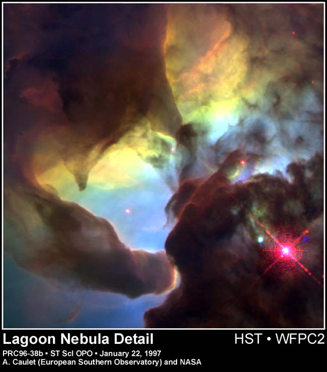 This NASA Hubble Space Telescope (HST) image reveals a pair of one-half light-year long interstellar "twisters" -- eerie funnels and twisted-rope structures -- in the heart of the Lagoon Nebula (Messier 8) which lies 5,000 light-years away in the direction of the constellation Sagittarius. The central hot star, O Herschel 36 (lower right), is the primary source of the ionizing radiation for the brightest region in the nebula, called the Hourglass. Other hot stars, also present in the nebula, are ionizing the extended optical nebulosity. The ionizing radiation induces photo-evaporation of the surfaces of the clouds and drives away violent stellar winds tearing into the cool clouds. Analogous to the spectacular phenomena of Earth tornadoes, the large difference in temperature between the hot surface and cold interior of the clouds, combined with the pressure of starlight, may produce strong horizontal shear to twist the clouds into their tornado-like appearance. Though the spiral shapes suggest the clouds are "twisting", future observations will be needed, perhaps with Hubble's next generation instruments, with the spectroscopic capabilities of the Space Telescope Imaging Spectrograph (STIS) or the Near Infrared Camera and Multi-Object Spectrometer (NICMOS), to actually measure velocities. The Lagoon Nebula and nebulae in other galaxies are sites where new stars are being born from dusty molecular clouds. These regions are the "space laboratories" for the astronomers to study how stars form and the interactions between the winds from stars and the gas nearby. By studying the wealth of data revealed by HST, astronomers will understand better how stars form in the nebulae. These color-coded images are the combination of individual exposures taken in July and September, 1995 with Hubble's Wide Field and Planetary Camera 2 (WFPC2) through three narrow-band filters (red light -- ionized sulphur atoms, blue light -- double ionized oxygen atoms, green light -- ionized hydrogen). This work is based on public data retrieved from the HST Archive, cosmic-ray cleaned, calibrated and combined by Adeline Caulet (Space Telescope European Coordinating Facility, European Space Agency). Credit: A. Caulet (ST-ECF, ESA) and NASA |