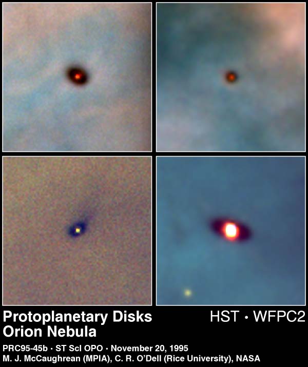 These are Hubble Space Telescope images of four newly discovered protoplanetary disks around young stars in the Orion nebula, located 1,500 light-years away. Gas and dust disks, long suspected by astronomers to be an early stage of planetary formation, can be directly seen in visible light by Hubble. Disks around young stars (also known as circumstellar or protoplanetary disks) are thought to be made up of 99% gas and 1% dust. Even that small amount of dust is enough to make the disks opaque and dark at visible wavelengths. The dark disks are seen in these images because they are silhouetted against the bright backdrop of the hot gas of the Orion nebula. The red glow in the center of each disk is a young, newly formed star, roughly one million years old (compared to the 4.5 billion year age of the Sun). The stars range in mass from 30% to 150% of the mass of our own Sun. As they evolve, the disks may go on to form planetary systems like our own. While only a handful of these dark silhouette disks have been discovered so far, they seem to belong to a much larger family of similar objects, and current indications are that protoplanetary disks are common in the Orion nebula. Mark McCaughrean of the Max-Planck-Institute for Astronomy, Heidelberg, Germany, and his collaborator C. Robert O'Dell from Rice University, Houston, Texas, spotted the new disks in large-scale survey images of the Orion nebula that O'Dell had taken with Hubble between January 1994 and March 1995. A detailed study of the disk images has been submitted for publication to the Astronomical Journal. Each image is 167 billion miles, or 257 billion kilometers across (30 times the diameter of our own solar system). The disks range in size from two to eight times the diameter of our solar system. The researchers explain the different circular or elliptical shapes as being due to the fact that each disk is tilted toward Earth by different degrees. Each picture is a composite of three images taken with Hubble's Wide Field and Planetary Camera 2, through narrow-band filters which admit the light of emission lines of ionized oxygen (represented here by blue), hydrogen (green), and nitrogen (red). The hot gas of the background Orion nebula emits strongly at each of these wavelengths, providing a strong backdrop for the disks to be silhouetted against. In each case, the central star is also clearly visible. Credit: Mark McCaughrean (Max-Planck-Institute for Astronomy), C. Robert O'Dell (Rice University), and NASA |