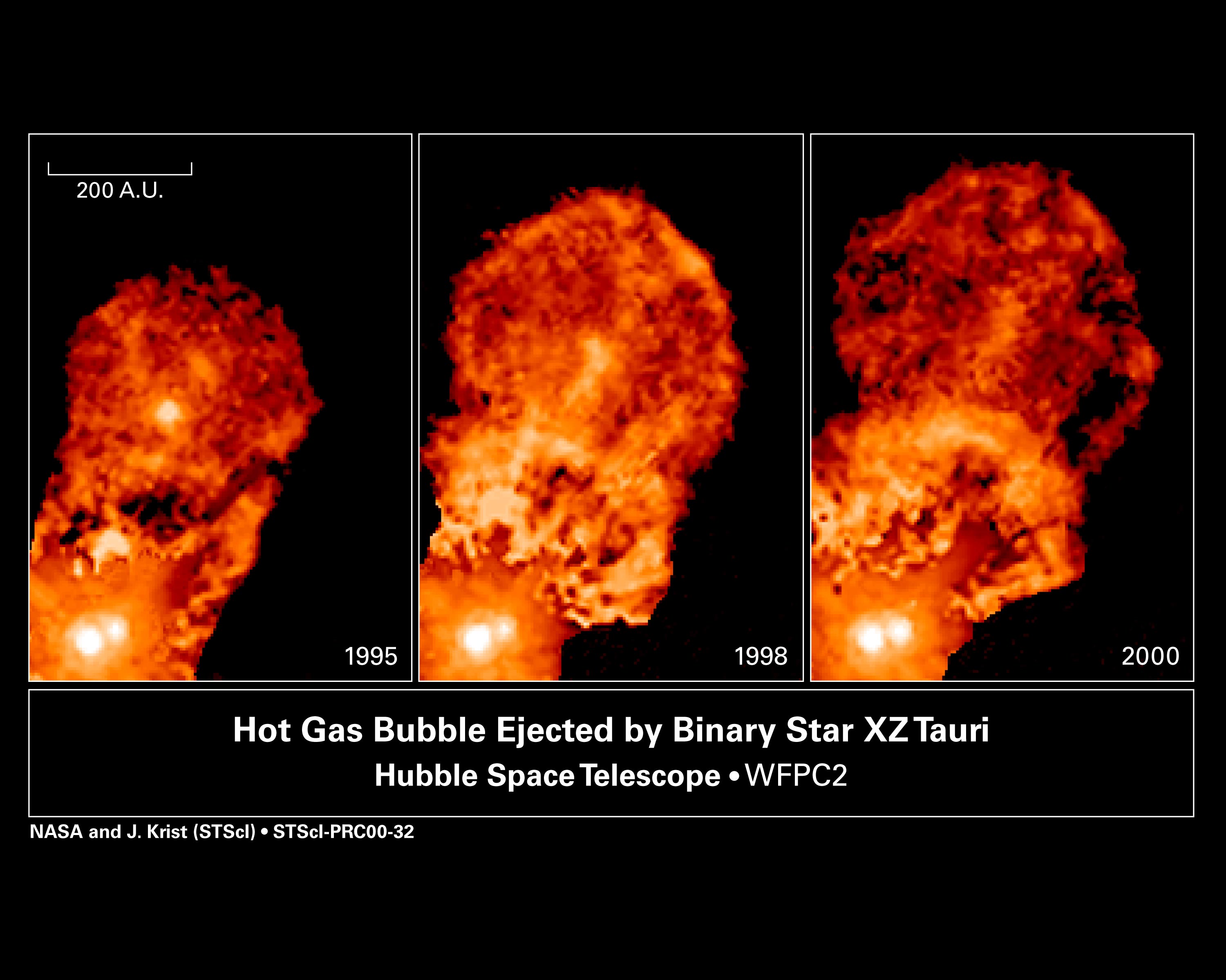 These images taken with the Hubble Space Telescope's Wide Field and Planetary Camera 2 reveal the evolution of bubbles of glowing gas being blown out from the young binary star system XZ Tauri. Gas from an unseen disk around one or both of the stars is channeled through magnetic fields surrounding the binary system and then is forced out into space at nearly 300,000 miles per hour (540,000 kilometers per hour). This outflow, which is only about 30 years old, extends nearly 60 billion miles (96 billion kilometers). Hubble first discovered this unique bubble in 1995, and additional observations were made between 1998 and 2000. These images show that there was a dramatic change in its appearance between 1995 and 1998. In 1995, the bubble's edge was the same brightness as its interior. However, when Hubble took another look at XZ Tauri in 1998, the edge was suddenly brighter. This brightening is probably caused by the hot gas cooling off, which allows electrons in the gas to recombine with atoms, a process that gives off light. This is the first time that astronomers have seen such a cooling zone "turn on." These images provide an unprecedented opportunity to study the development of a very recent outflow from young (about 1 million years old) stars. Credits: NASA, John Krist (Space Telescope Science Institute), Karl Stapelfeldt (Jet Propulsion Laboratory), Jeff Hester (Arizona State University), Chris Burrows (European Space Agency/Space Telescope Science Institute) |