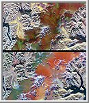 This pair of images illustrates the ability of multi-parameter radar imaging sensors such as the Spaceborne Imaging Radar-C/X-band Synthetic Aperture radar to detect climate related changes on the Patagonian ice fields in the Andes Mountains of Chile and Argentina. The images show nearly the same area of the south Patagonian ice field as it was imaged during two space shuttle flights in 1994 that were conducted five-and-a-half months apart. The images, centered at 49.0 degrees south latitude and 73.5 degrees west longitude, include several large outlet glaciers. The images were acquired by SIR-C/X-SAR on board the space shuttle Endeavour during April and October 1994. The top image was acquired on April 14, 1994, at 10:46 p.m. local time, while the bottom image was acquired on October 5,1994, at 10:57 p.m. local time. Both were acquired during the 77th orbit of the space shuttle. The area shown is approximately 100 kilometers by 58 kilometers (62 miles by 36 miles) with north toward the upper right. The colors in the images were obtained using the following radar channels: red represents the C-band (horizontally transmitted and received); green represents the L-band (horizontally transmitted and received); blue represents the L-band (horizontally transmitted and vertically received). The overall dark tone of the colors in the central portion of the April image indicates that the interior of the ice field is covered with thick wet snow. The outlet glaciers, consisting of rough bare ice, are the brightly colored yellow and purple lobes which terminate at calving fronts into the dark waters of lakes and fiords. During the second mission the temperatures were colder and the corresponding change in snow and ice conditions is readily apparent by comparing the images. The interior of the ice field is brighter because of increased radar return from the dryer snow. The distinct green/orange boundary on the ice field indicates an abrupt change in the structure of the snowcap, a direct indication of the steep meteorological gradients known to exist in this region. The bluer color of the outlet glaciers is probably due to a thin snow cover. A portion of the terminus of the outlet glacier at the top left center of the images has advanced approximately 600 meters (1,970 feet) in the five-and-a- half months between the two missions. Because of the persistent cloud cover this observation was only possible by using the orbiting, remote imaging radar system. Spaceborne Imaging Radar-C and X-band Synthetic Aperture Radar (SIR-C/X-SAR) is part of NASA's Mission to Planet Earth. The radars illuminate Earth with microwaves, allowing detailed observations at any time, regardless of weather or sunlight conditions. SIR-C/X-SAR uses three microwave wavelengths: L-band (24 cm), C-band (6 cm) and X-band (3 cm). The multi-frequency data will be used by the international scientific community to better understand the global environment and how it is changing. The SIR-C/X-SAR data, complemented by aircraft and ground studies, will give scientists clearer insights into those environmental changes which are caused by nature and those changes which are induced by human activity. SIR-C was developed by NASA's Jet Propulsion Laboratory. X-SAR was developed by the Dornier and Alenia Spazio companies for the German space agency, Deutsche Agentur fuer Raumfahrtangelegenheiten (DARA), and the Italian space agency, Agenzia Spaziale Italiana (ASI), with the Deutsche Forschungsanstalt fuer Luft und Raumfahrt e.v.(DLR), the major partner in science, operations and data processing of X-SAR. |