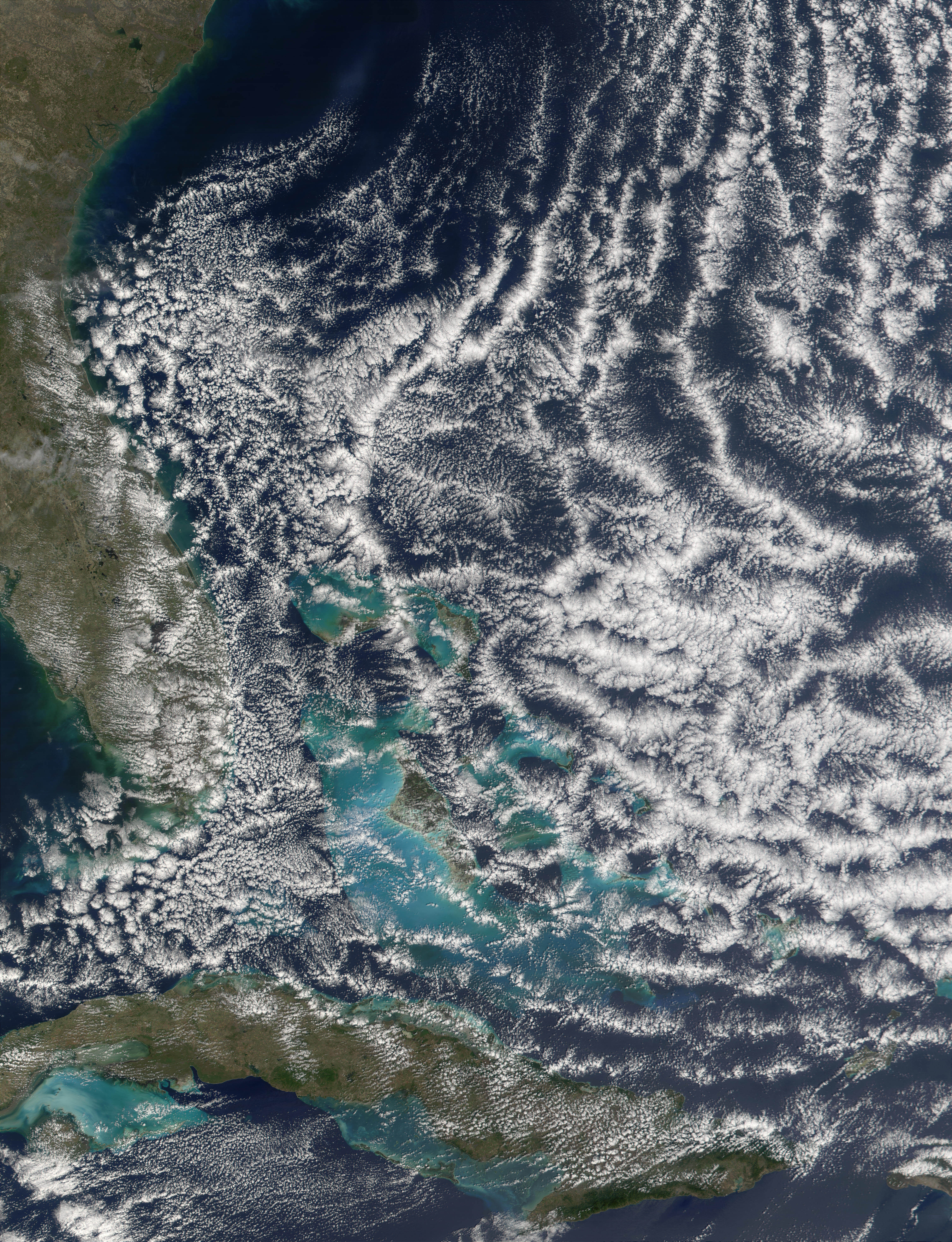 What atmospheric scientists refer to as open cell cloud formation is a regular occurrence on the back side of a low pressure system or cyclone in the mid-latitudes. In the northern hemisphere, a low-pressure system will draw in surrounding air and spin it counterclockwise. That means that on the back side of the low pressure center, cold air will be drawn in from the north, and on the front side, warm air will be drawn up from latitudes closer to the equator. This movement of an air mass is called advection, and when cold air advection occurs over warmer waters, open cell cloud formations often result. This MODIS image shows open cell cloud formation over the Atlantic Ocean off the southeast coast of the United States on February 19, 2002. This particular formation is the result of a low-pressure system sitting out in the North Atlantic Ocean a few hundred miles east of Massachusetts. (The low can be seen as the comma-shaped figure in the GOES-8 Infrared image from February 19, 2002.) Cold air is being drawn down from the north on the western side of the low and the open cell cumulus clouds begin to form as the cold air passes over the warmer Caribbean waters. |