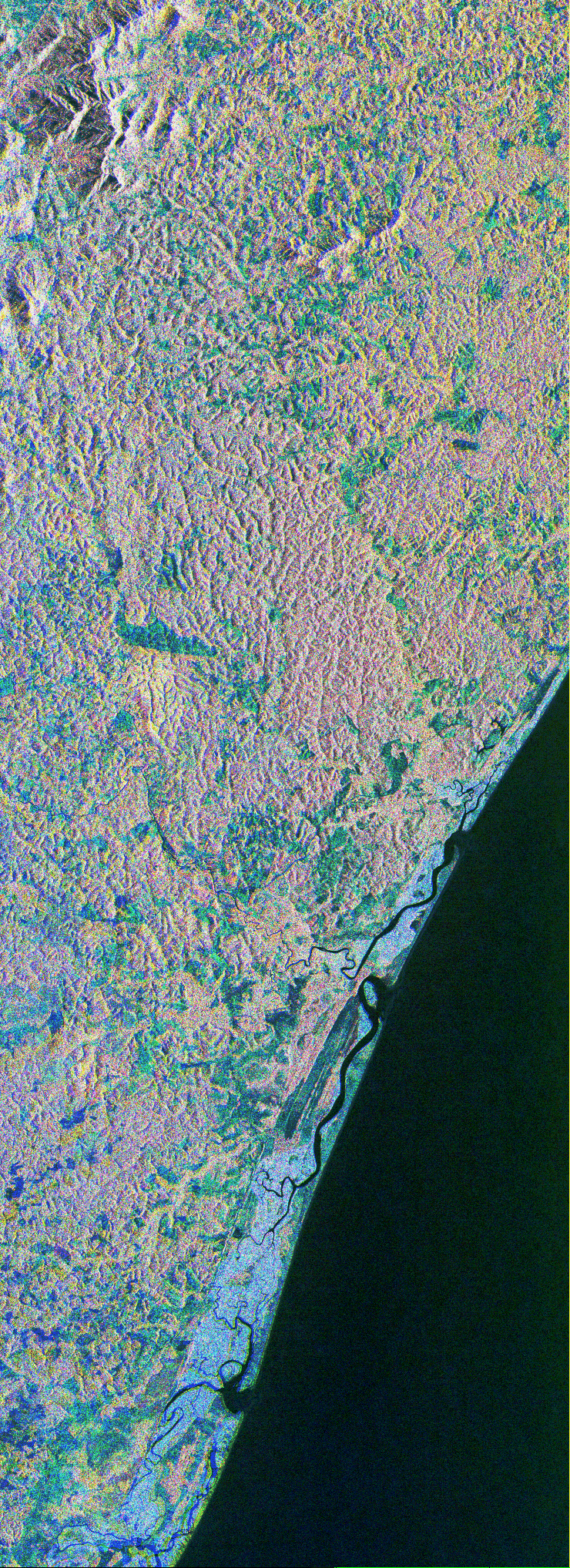 This is a color composite image of southern Bahia, Brazil, centered at 15.22 degree south latitude and 39.07 degrees west longitude. The image was acquired by the Spaceborne Imaging Radar-C/X-band Synthetic Aperture Radar aboard the space shuttle Endeavour on its 38th orbit of Earth on October 2, 1994. The image covers an area centered over the Una Biological Reserve, one the largest protected areas in northeastern Brazil. The 7,000-hectare reserve is administered by the Brazilian Institute for the Environment and is part of the larger Atlantic coastal forest, a narrow band of rain forest extending along the eastern coast of Brazil. The Atlantic coastal forest of southern Bahia is one of the world's most threatened and diverse ecosystems. Due to widespread settlement, only 2 to 5 percent of the original forest cover remains. Yet the region still contains an astounding variety of plants and animals, including a large number of endemic species. More than half of the region's tree species and 80 percent of its animal species are indigenous and found nowhere else on Earth. The Una Reserve is also the only federally protected habitat for the golden-headed lion tamarin, the yellow-breasted capuchin monkey and many other endangered species. In the past few years, scientists from Brazilian and international conservation organizations have coordinated efforts to study the biological diversity of this region and to develop practical and economically viable options for preserving the remaining primary forests in southern Bahia. The shuttle imaging radar is used in this study to identify various land uses and vegetation types, including remaining patches of primary forest, cabruca forest (cacao planted in the understory of the native forest), secondary forest, pasture and coastal mangrove. Standard remote-sensing technology that relies on light reflected from the forest canopy cannot accurately distinguish between cabruca and undisturbed forest. Optical remote sensing is also limited by the nearly continuous cloud cover in the region and heavy rainfall, which occurs more than 150 days each year. The ability of the shuttle radars to "see" through the forest canopy to the cultivated cacao below -- independent of weather or sunlight conditions -- will allow researchers to distinguish forest from cabruca in unprecedented detail. This SIR-C/X-SAR image was produced by assigning red to the L-band, green to the C-band and blue to the X-band. The Una Reserve is located in the middle of the image west of the coastline and slightly northwest of Comandatuba River. The reserve's primary forests are easily detected by the pink areas in the image. The intensity of red in these areas is due to the high density of forest vegetation (biomass) detected by the radar's L-band (horizontally transmitted and vertically received) channel. Secondary forest is visible along the reserve's eastern border. The Serra do Mar mountain range is located in the top left portion of the image. Cabruca forest to the west of Una Reserve has a different texture and a yellow color. The removal of understory in cabruca forest reduces its biomass relative to primary forest, which changes the L-band and C-band penetration depth and returns, and produces a different texture and color in the image. The region along the Atlantic is mainly mangrove swamp, agricultural fields and urban areas. The high intensity of blue in this region is a result of increasing X-band return in areas covered with swamp and low vegetation. The image clearly separates the mangrove region (east of coastal Highway 001, shown in blue) from the taller and dryer forest west of the highway. The high resolution capability of SIR-C/X-SAR imaging and the sensitivity of its frequency and polarization channels to various land covers will be used for monitoring and mapping areas of importance for conservation. Spaceborne Imaging Radar-C/X-band Synthetic Aperture Radar(SIR-C/X-SAR) is part of NASA's Mission to Planet Earth. The radars illuminate Earth with microwaves, allowing detailed observations at any time, regardless of weather or sunlight conditions. SIR-C/X-SAR uses three microwave wavelengths: L-band (24 cm), C-band (6 cm) and X-band (3 cm). The multi-frequency data will be used by the international scientific community to better understand the global environment and how it is changing. The SIR-C/X-SAR data, complemented by aircraft and ground studies, will give scientists clearer insights into those environmental changes which are caused by nature and those changes which are induced by human activity. SIR-C was developed by NASA's Jet Propulsion Laboratory. X-SAR was developed by the Dornier and Alenia Spazio companies for the German space agency, Deutsche Agentur fuer Raumfahrtangelegenheiten (DARA), and the Italian space agency, Agenzia Spaziale Italiana (ASI) with the Deutsche Forschungsanstalt fuer luft und Raumfahrt e.V.(DLR), the major partner in science, operations and data processing of X-SAR. This image is in the public domain and is copyright free. |