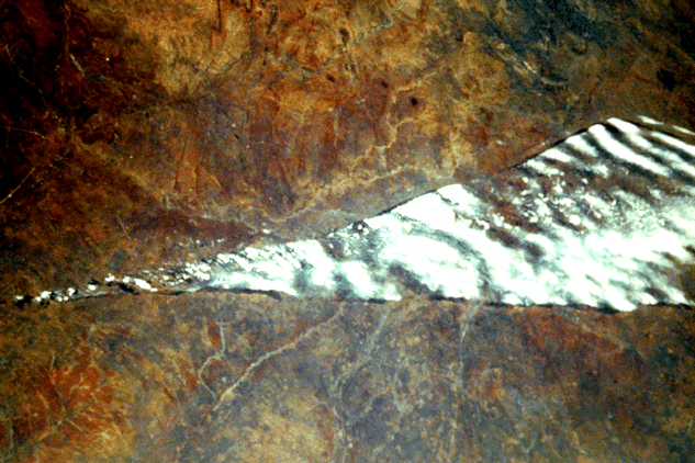 This photograph taken over Namibia reveals another effect of jet streams. Here two streams converge; cloud has formed in the corridor between the two streams. Turbulence along the margins of the jet stream may explain the sharp boundary. The point of convergence of the two air streams is precisely located by this photograph. Shadows mark the cloud edges against a sunlit Namibian backdrop. |