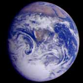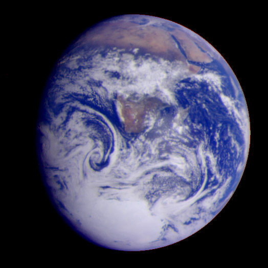 This color image of the Earth was obtained by the Galileo spacecraft on Dec. 11, 1990, when the spacecraft was about 1.5 million miles from the Earth. The color composite used images taken through the red, green and violet filters. Africa stretches from the center to the top of the picture with the Arabian Peninsula off to its right. The white, sunlit continent of Antarctica is at the bottom. This is a frame of the Galileo Earth spin movie, a 500-frame time-lapse motion picture showing a 25-hour period of Earth's rotation and atmospheric dynamics. |