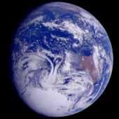 This color image of the Earth was obtained by the Galileo spacecraft on December 11, 1990, when the spacecraft was about 1.5 million miles from the Earth. The color composite used images taken through the red, green and violet filters. India is near the top of the picture, and Australia is to the right of center. The white, sunlit continent of Antarctica is below. Picturesque weather fronts are visible in the South Pacific, lower right. This is a frame of the Galileo Earth spin movie, a 500-frame time-lapse motion picture showing a 25-hour period of Earth's rotation and atmospheric dynamics. |