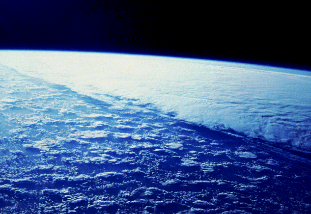 All that can be seen in this photograph is cloud stretching several hundred kilometers to the limb of the Earth, yet it tells us a great deal about the water in the Bering Sea below. The line or cloud margin running diagonally across the frame with dense, thick cloud to the right and lighter, more broken cloud to the left reflects an ocean current margin. A difference in water temperature on either side of the margin is reflected in the cloud forms condensing above. This striking cloud boundary stretches for 800-960 kilometers (500-600 miles) in this photograph. |